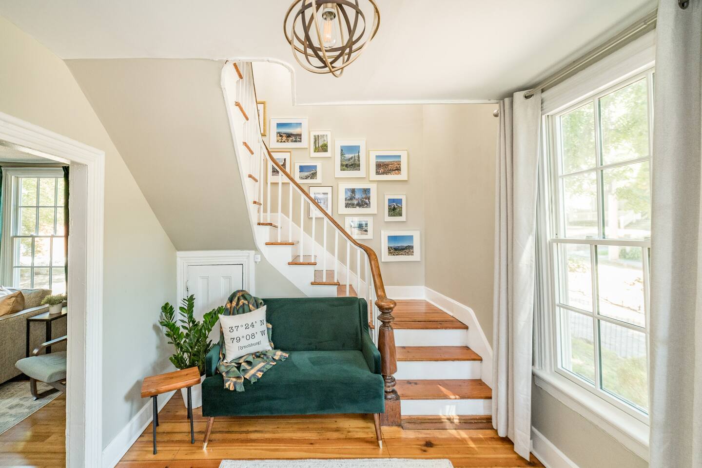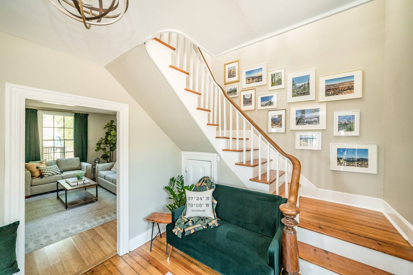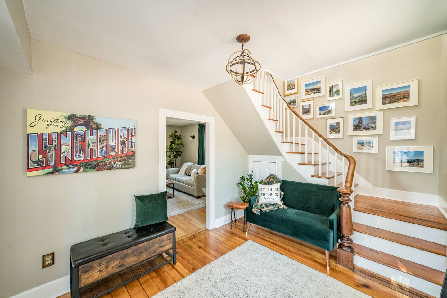 Victorian-framed home packed w/ historic character + modern amenities! -Awesome location in quiet historic district 3 min to downtown Lynchburg -Romantic primary suite, 2 king bedrooms -Subtle national parks theme gives it the name "Park Place" -Walk 10 min to downtown OR along miles of Blackwater Creek nature trails -Fenced park w/ playground & awesome bagel shop in the neighborhood -12 min to Liberty U & Univ of Lynchburg. Extended stays welcome!