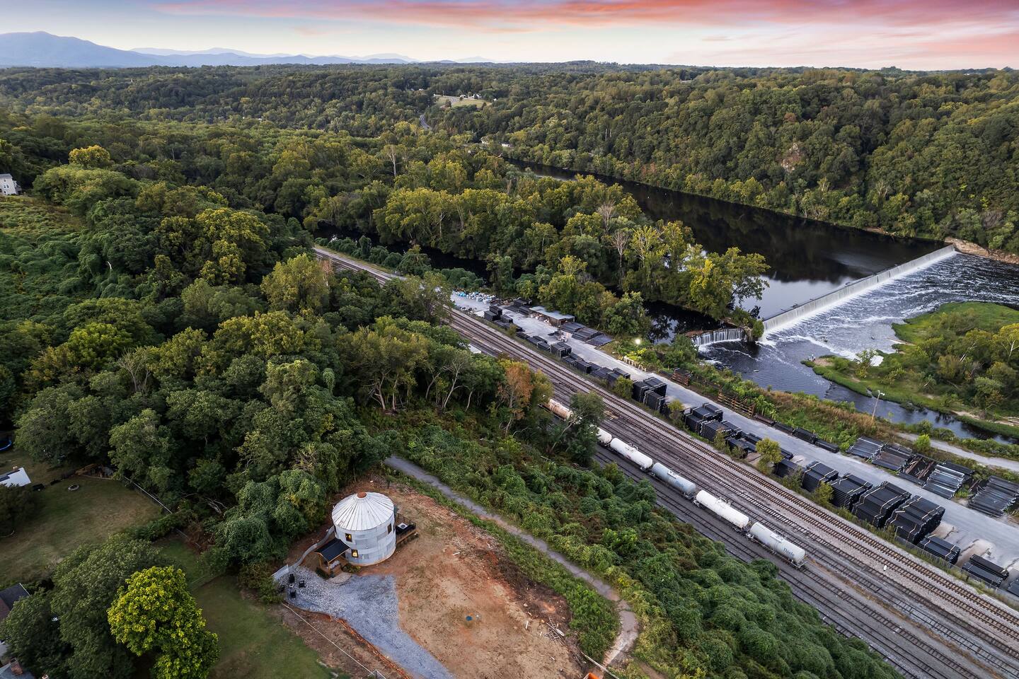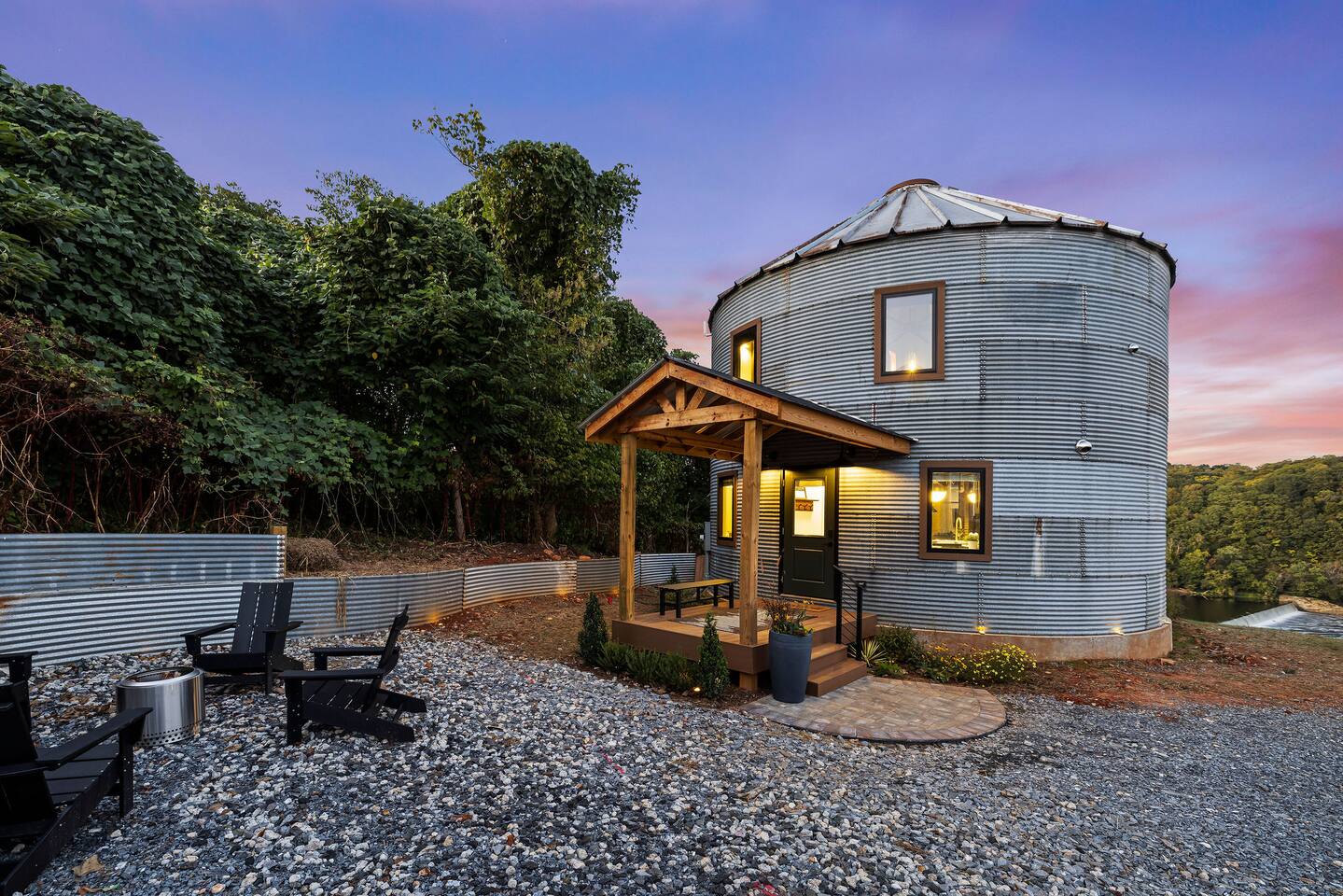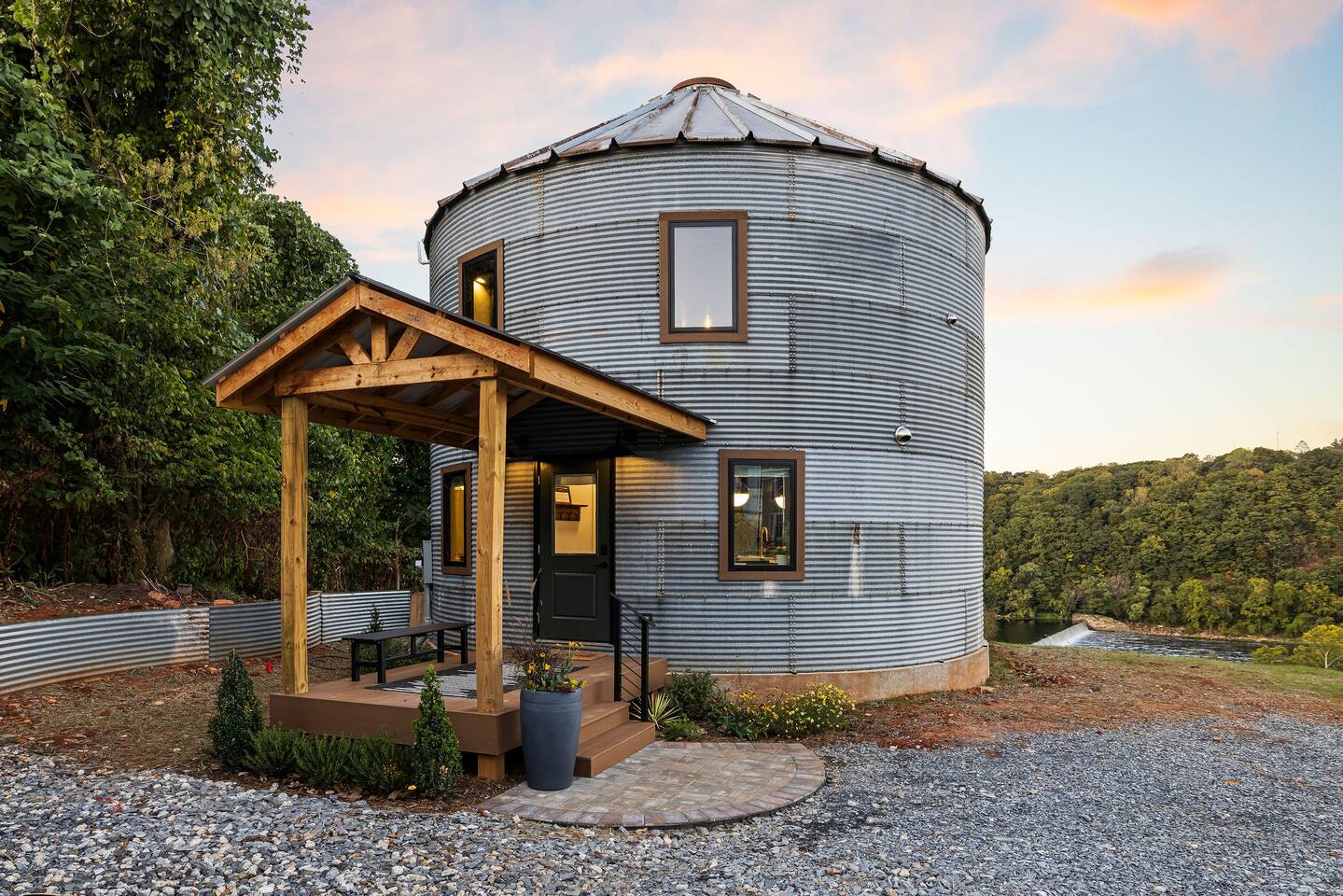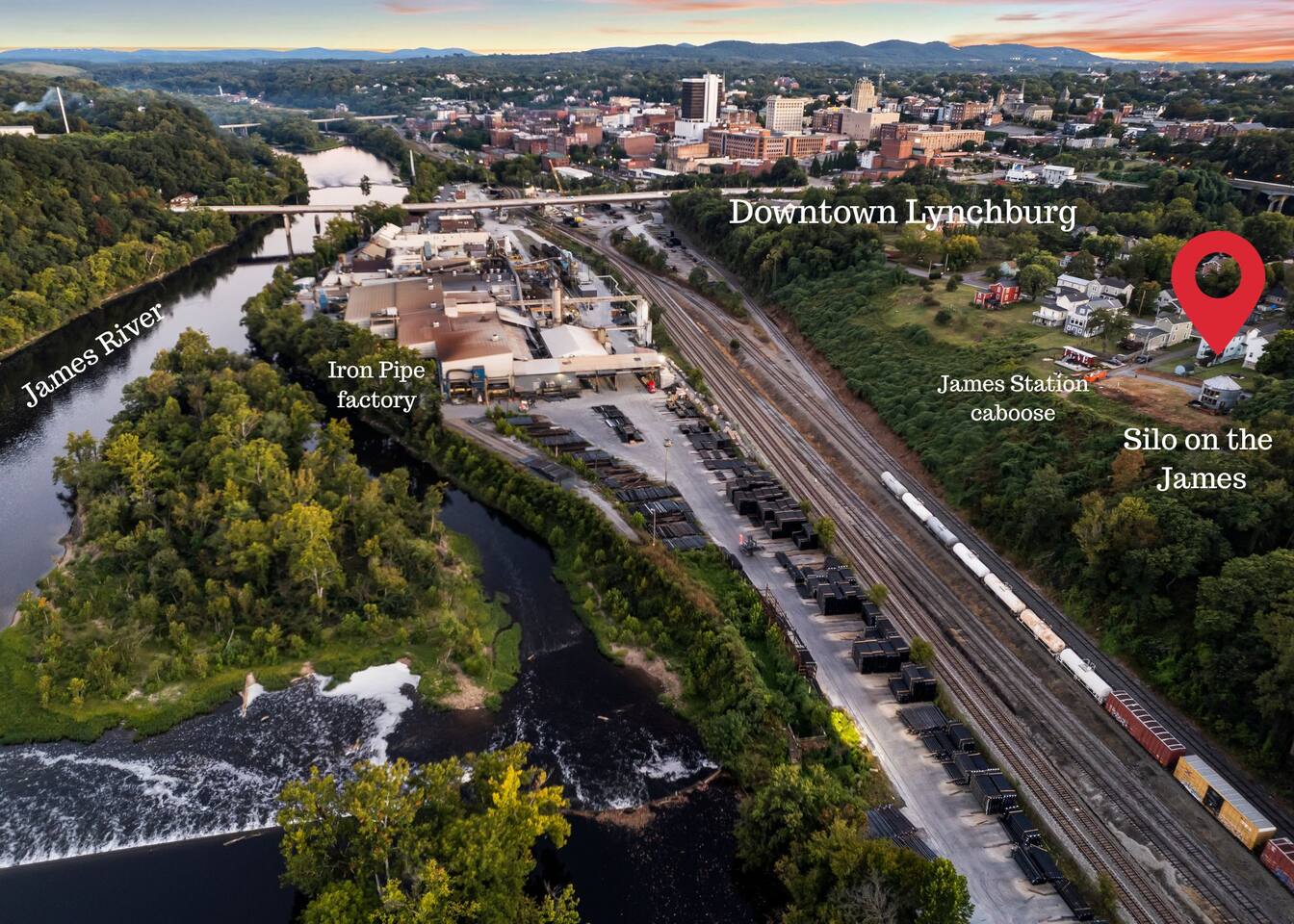 Welcome to Silo on the James, a luxe grain bin house overlooking the most scenic part of the James River! -1/2 mi walk to charming + historic downtown Lynchburg & paved Blackwater Creek nature trails -985 sq. ft, 30+ ft ceiling, fireplace, fast wifi -King bed loft + full bath, queen Murphy bed -Solo Stove fire pit, gas grill, deck w/ views -Watch the trains + factory below -Unique getaway for couples, friends or small families!