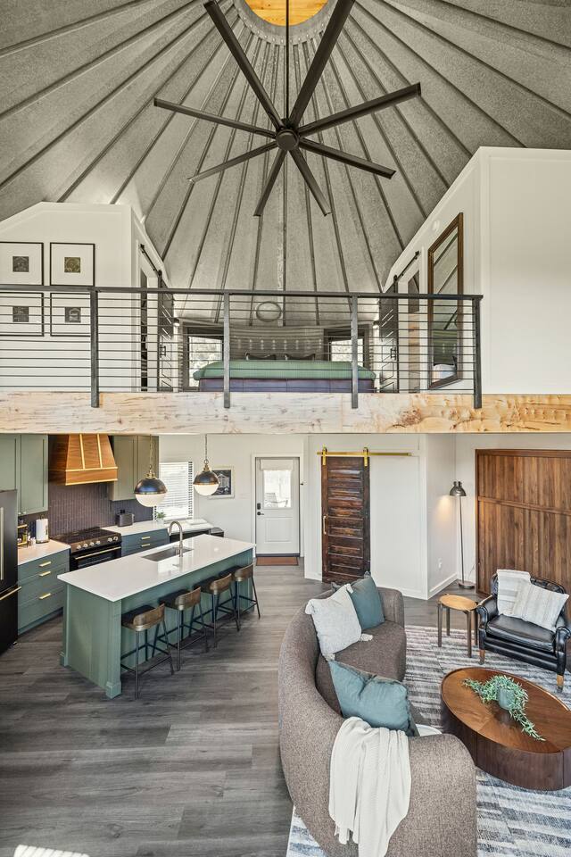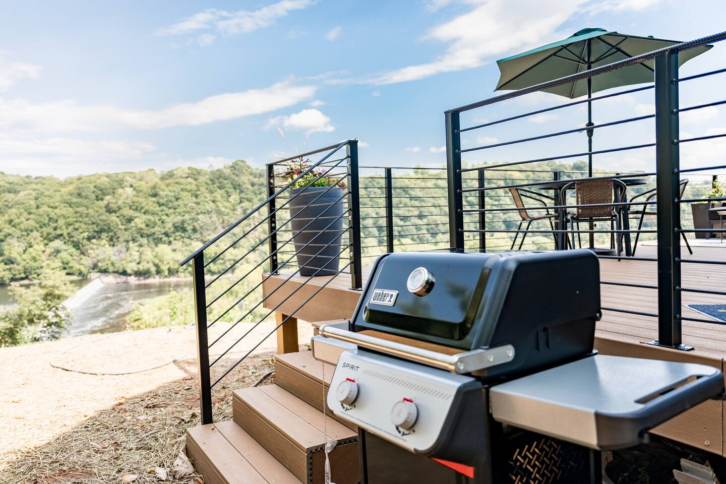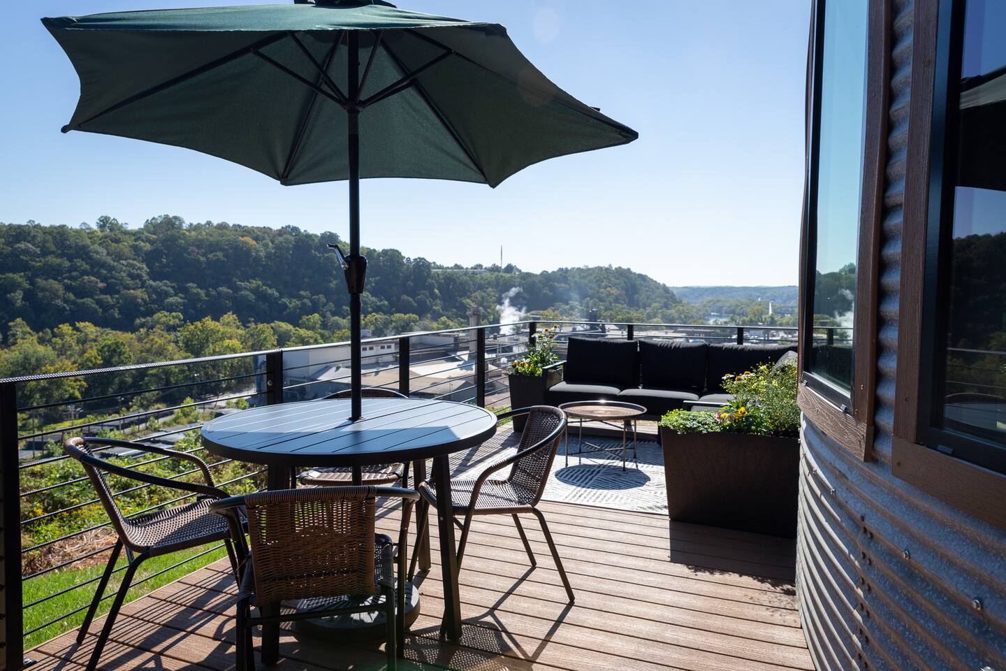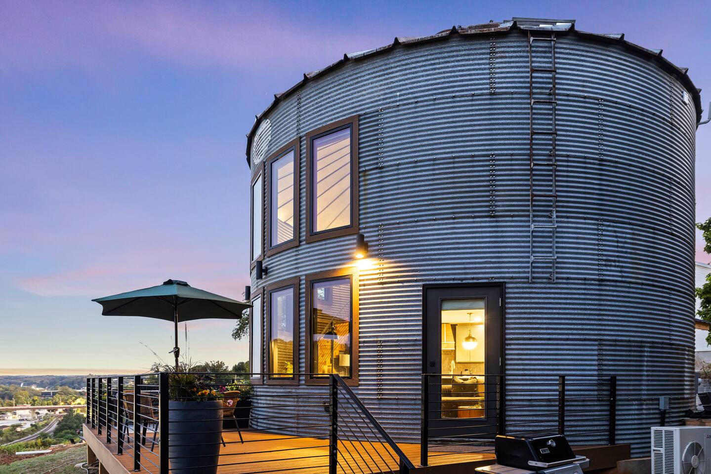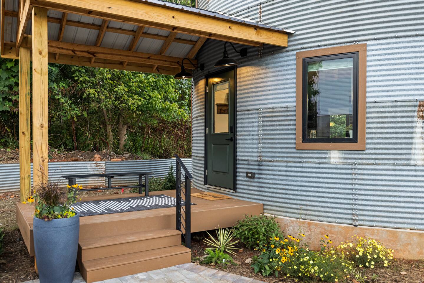 Welcome to Silo on the James, a luxe grain bin house overlooking the most scenic part of the James River! -1/2 mi walk to charming + historic downtown Lynchburg & paved Blackwater Creek nature trails -985 sq. ft, 30+ ft ceiling, fireplace, fast wifi -King bed loft + full bath, queen Murphy bed -Solo Stove fire pit, gas grill, deck w/ views -Watch the trains + factory below -Unique getaway for couples, friends or small families!
