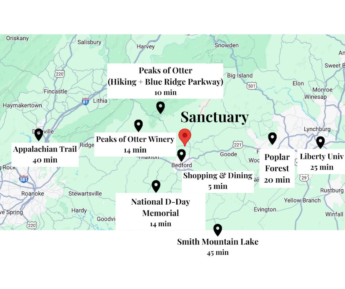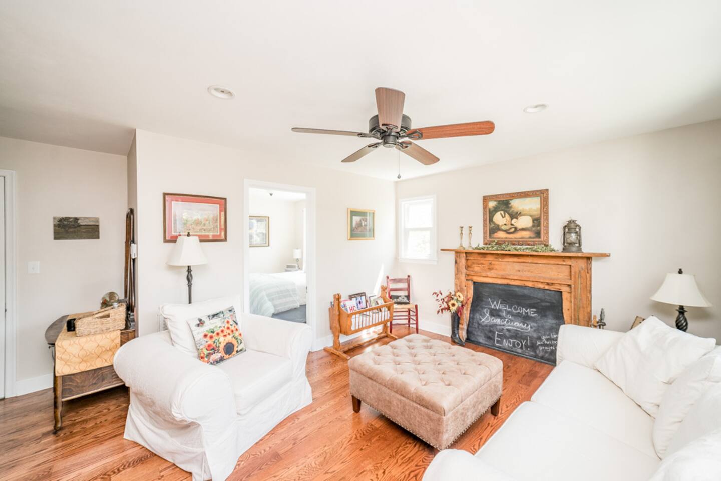 Unplug. Unwind. Refresh. The Sanctuary is your retreat from the everyday. -17 acre farm that boasts stunning sunset views of the iconic Peaks of Otter -Meticulously clean couples' suite with private entrance + cozy farmhouse environment -Fire pit, stocked pond, gazebo, hammock, nature, full kitchen -5 min to town (Bedford), 10 min to great hiking in the Blue Ridge Mtns, 25-30 min to Lynchburg Perfect for vacation, romantic getaway, or personal retreat with option for on-site life coaching.
